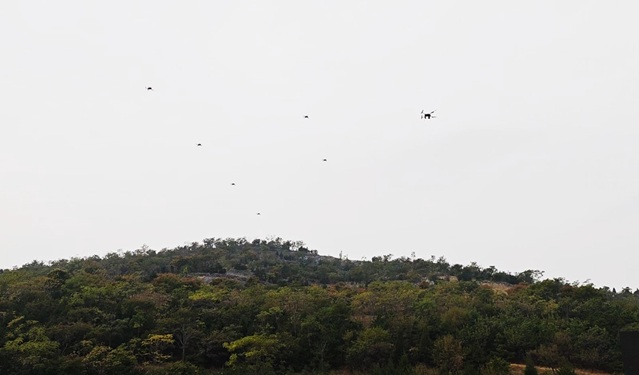 进入实战灭火环节,天津测绘院无人机分队精准执行“空中压制+地面合围”战术。在前期压制阶段,公司灭火专用无人机携带50公斤级灭火弹升空,在火头上方精准投掷,瞬间形成阻燃隔离带,有效压制火势蔓延。同时,地面水泵队伍快速抵达火场周边,织起“空-地”立体防御网,火势被迅速控制。在独立灭火阶段,4架灭火无人机组成编队,实施四轮精准打击。每枚灭火弹在火点正上方爆破,释放高效阻燃剂,单次覆盖面积超50平方米。经过连续打击,明火被彻底扑灭,实现“发现—定位—打击”精准处置。